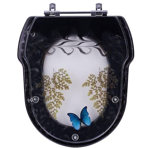Tampa De Vaso Decorada Hampton Preto Para Louça Incepa Tampa De Vaso Hampton Decorada com Borboleta Azul e Avencas e, detalhe marmorizado Preto Para Louça Incepa é a escolha perfeita para seu banheiro. O Assento Sanitário Poliéster é considerado o melhor tipo de assentos sanitários do mercado pelo seu acabamento impecável e excelente durabilidade. Este assento de vaso sanitário Hampton Preto é produzido em resina maciça de poliéster. O poliéster é uma resina semelhante ao acrílico, só que mais robusta / resistente. Por isso, é totalmente impermeável, pode ser lavado com água à vontade. Fácil de limpar. Não acumula sujeira.