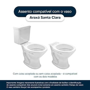 Detalhes e Cuidados Especiais: * Cor: Branco * Compatibilidade: Modelo Araxa da marca Santa Clara * Conteúdo da Embalagem: Assento sanitário, parafusos de fixação e instruções de instalação.