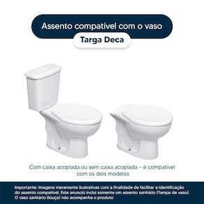 Detalhes e Cuidados Especiais: * Cor: Branco * Compatibilidade: Modelo Targa da marca Deca * Conteúdo da Embalagem: Assento sanitário, parafusos de fixação e instruções de instalação.