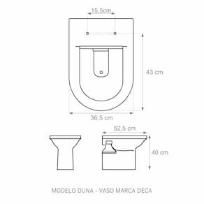 Assento Sanitário (tampa de vaso) fabricado em madeira MDF com pintura laqueada, com proteção raios UV, que garante excelente acabamento e durabilidade. Compatível com vasos (bacias/louças) sanitários com ou sem caixa acoplada. Tem calços de PVC instalados na tampa e no assento para proporcionar estabilidade ao uso, pois distribui o peso uniformemente sobre a louça sanitária. Montagem simples e fácil. Possui ferragem em alumínio anodizado que não enferruja/oxida e oferece muita resistência. O assento é acompanhado por parafusos para instalação. Embalagem dupla reforçada garante o recebimento do produto totalmente protegido. Especificações: - Dimensões da caixa: largura: 49,50cm. Altura: 4,00cm comprimento: 39,50cm - Peso do produto: 1,98kg - Acabamento: brilhante - Uso: este assento é adequado para uso na louça Deca modelo Duna - Garantia: 3 meses - Itens inclusos: Tampa e assento em MDF com calços de PVC, ferragem inoxidável, embalagem duplamente reforçada. Contém todos os parafusos e encaixes para instalação, sendo necessária somente uma chave de fenda para instalar o produto na louça sanitária. Instalação: posicione o produto, devidamente centralizado, em cima do vaso sanitário. Sem desmontar a ferragem, insira as buchas de borracha dentro dos furos da bacia sanitária. Encaixe os parafusos e posicione as porcas. Utilizando uma chave de fenda, aperte o parafuso no sentido horário até que o assento esteja firme e fixo no vaso. Manutenção: recomendamos a limpeza periódica com pano levemente umedecido com sabão neutro. Não usar esponjas abrasivas ou palha de aço nem qualquer tipo de produto químico.