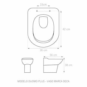 Assento Sanitário (tampa de vaso) fabricado em madeira MDF com pintura laqueada, com proteção raios UV, que garante excelente acabamento e durabilidade. Compatível com vasos (bacias/louças) sanitários com ou sem caixa acoplada. Tem calços de PVC instalados na tampa e no assento para proporcionar estabilidade ao uso, pois distribui o peso uniformemente sobre a louça sanitária. Montagem simples e fácil. Possui ferragem em alumínio anodizado que não enferruja/oxida e oferece muita resistência. O assento é acompanhado por parafusos para instalação. Embalagem dupla reforçada garante o recebimento do produto totalmente protegido. Especificações: - Dimensões da caixa: largura: 49,50cm. Altura: 4,00cm comprimento: 39,50cm - Peso do produto: 1,98kg - Acabamento: brilhante - Uso: este assento é adequado para uso na louça Deca modelo Duomo Plus - Garantia: 3 meses - Itens inclusos: Tampa e assento em MDF com calços de PVC, ferragem inoxidável, embalagem duplamente reforçada. Contém todos os parafusos e encaixes para instalação, sendo necessária somente uma chave de fenda para instalar o produto na louça sanitária. Instalação: posicione o produto, devidamente centralizado, em cima do vaso sanitário. Sem desmontar a ferragem, insira as buchas de borracha dentro dos furos da bacia sanitária. Encaixe os parafusos e posicione as porcas. Utilizando uma chave de fenda, aperte o parafuso no sentido horário até que o assento esteja firme e fixo no vaso. Manutenção: recomendamos a limpeza periódica com pano levemente umedecido com sabão neutro. Não usar esponjas abrasivas ou palha de aço nem qualquer tipo de produto químico.