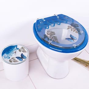 Assento Sanitário fabricado em resina virgem de Poliéster com decoração de Avenca e Borboleta inédita e exclusiva e com acabamento de superfície polido de alto brilho. Ferragem ultrarresistente e que não oxida com elevadíssimo padrão de acabamento. Possui 10 calços de PVC distribuídos na tampa e no assento, que possibilitam total estabilidade sobre a louça. Maciço em resina de Poliéster é totalmente impermeável. Com excepcional durabilidade tem design específico e diferenciado. Os produtos de poliéster com decoração podem apresentar uma eventual variação em relação as fotos apresentadas, pois tem em seu processo de fabricação uma parte puramente artesanal, o que lhes confere identidade única e absoluta originalidade. Projetado para cada modelo de louça com medidas exatas e precisas para o encaixe em seu vaso sanitário. CESTO DE LIXO Lixeira na mesma decoração do assento sanitário. Informações Técnicas: Assento Sanitário: Tampa e Assento em Resina Virgem de Poliéster, calços de PVC para assentamento na louça, ferragem em metal inoxidável com sistema de fixação regulável, embalagem dupla reforçada. Cesto de lixo: corpo em polipropileno branco, tampa em resina de poliester com decoração azul e borboleta azul Modelo: Convencional/ Oval/ Universal Cor: Marmorizado Azul Uso: Para Todas as Louças Dimensões Caixa: 54 cm x 42 cm x 5 cm Importante: todos os elementos decorativos das fotos não estão inclusos (por exemplo: vaso sanitário, flor / planta decorativa). Este anuncio inclui somente o assento sanitário e a lixeira