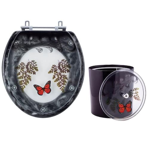Kit contendo 1 assento sanitário decorado borboleta na cor Preta e 1 lixeira na mesma decoração. Escolha perfeita para completar seu banheiro. Assento Sanitário em resina de poliester, material semelhante ao acrílico só que mais robusto / resistente. É totalmente impermeável. O assento (parte onde senta) tem marmorizado na cor Preta. A tampa é transparente com decoração de avenca com borboleta. A decoração é uma transparência que fica dentro da resina, não sai e não desbota com a limpeza diária. Lixeira decorada com tampa em resina de poliester, no mesmo material e decoração do assento sanitário. O corpo da lixeira é em plástico polipropileno, muito resistente e fácil de limpar. Medidas do assento sanitário: 43cm comprimento x 38cm largura x 15cm distancia entre os parafusos. É compatível com vasos sanitários de modelo convencional / oval / universal. Medidas da lixeira: 20cm altura x 20cm largura