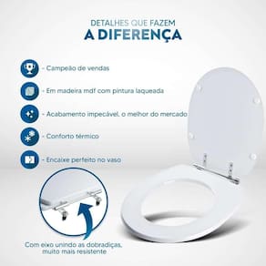 Itens inclusos: assento e tampa em madeira MDF com pintura laqueada. Ferragens metálicas em alumínio anodizado muito resistente, não oxidam e não enferrujam.