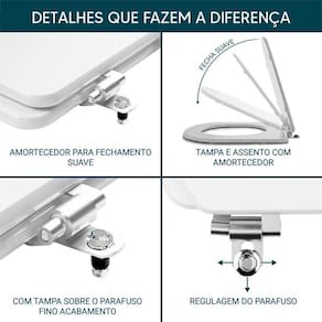 Itens inclusos: assento e tampa em madeira MDF com pintura laqueada. Ferragens metálicas em alumínio anodizado muito resistente, não oxidam e não enferrujam.