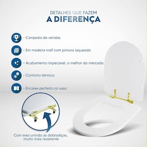Durabilidade e Resistência: Fabricado em MDF com camadas de pintura laqueada, este assento oferece não apenas beleza, mas também conforto térmico e alta resistência. Seu acabamento impecável adiciona um toque de classe ao seu banheiro.
