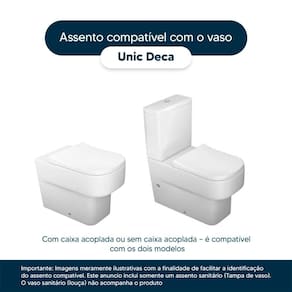 Instalação Simples e Rápida: Com todos os parafusos e componentes necessários inclusos, a instalação é rápida e descomplicada. Seu novo assento estará pronto para uso em questão de minutos. Desenvolvido especificamente para o modelo Unic da marca Deca, com ou sem caixa acoplada, proporciona um encaixe perfeito, oferecendo estabilidade e conforto durante o uso.