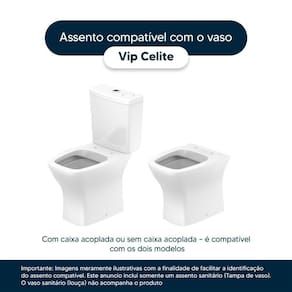 Instalação Simples e Rápida: Com todos os parafusos e componentes necessários inclusos, a instalação é rápida e descomplicada. Seu novo assento estará pronto para uso em questão de minutos. Desenvolvido especificamente para o modelo Vip da marca Celite, com ou sem caixa acoplada, proporciona um encaixe perfeito, oferecendo estabilidade e conforto durante o uso.