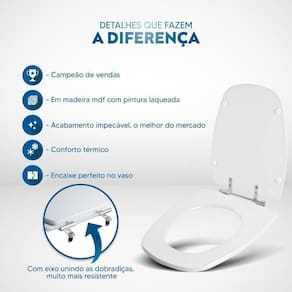 Durabilidade e Resistência: Fabricado em MDF com camadas de pintura laqueada, este assento oferece não apenas beleza, mas também conforto térmico e alta resistência. Seu acabamento impecável adiciona um toque de classe ao seu banheiro.