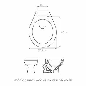 Assento Sanitário tampa de vaso fabricado em madeira MDF com pintura laqueada, com proteção raios UV, que garante excelente acabamento e durabilidade. Compatível com vasos bacias/louças sanitários com ou sem caixa acoplada. Tem calços de PVC instalados na tampa e no assento para proporcionar estabilidade ao uso, pois distribui o peso uniformemente sobre a louça sanitária. Montagem simples e fácil. Possui ferragem em alumínio anodizado que não enferruja/oxida e oferece muita resistência. O assento é acompanhado por parafusos para instalação. Embalagem dupla reforçada garante o recebimento do produto totalmente protegido. Especificações: - Dimensões da caixa: largura: 51,50cm. Altura: 4,00cm comprimento: 38,00cm - Peso do produto: 1,98kg - Acabamento: brilhante - Uso: este assento é adequado para uso na louça Ideal de modelo Oriane - : 3 meses - Itens inclusos: Tampa e assento com calços de PVC, ferragem inoxidável, embalagem duplamente reforçada. Contém todos os parafusos e encaixes para instalação, sendo necessária somente uma chave de fenda para instalar o produto na louça sanitária. Instalação: posicione o produto, devidamente centralizado, em cima do vaso sanitário. Sem desmontar a ferragem, insira as buchas de borracha dentro dos furos da bacia sanitária. Utilizando uma chave de fenda, aperte o parafuso no sentido horário até que o assento esteja firme no vaso. Manutenção: recomendamos a limpeza periódica com pano levemente umedecido com sabão neutro. Não usar esponjas abrasivas ou palha de aço nem qualquer tipo de produto químico. Marca: Não Informado