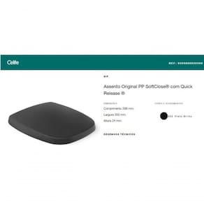 Assento PP Softclose com fácil remoção City e Like da Celite Material do assento: Polipropileno. Fácil remoção A tecnologia de fácil remoção permite que a instalação e remoção do assento aconteça de forma muito fácil e rápida com apenas um clique. Softclose Assentos e tampas com a Tecnologia Softclose permitem o fechamento suave do produto, aliviando o impacto entre a tampa e o vaso, evitando incidentes com crianças e ruídos com o fechamento da tampa, garantindo a durabilidade do produto. Benefícios do assento City, Like e Vip Fácil instalação e higiênização, alta resistência a riscos, sistema anti-derrapante, não acumula sujeira. Importante Este assento é compatível com os vasos sanitários City e Like. Veja o manual do usuário para a correta manutenção do produto. Compatível com os seguintes modelos de vasos sanitários Referência 1645600775300 - Bacia para caixa City. Referência 1203010770300 - Bacia convencional City. Referência 1643550770300 - Bacia para caixa Like. Referência 1643050770300 - Bacia convencional Like. C A R A C T E R Í S T I C A S Assento PP Softclose com fácil remoção City e Like da Celite Material do assento: Polipropileno. Fácil remoção A tecnologia de fácil remoção permite que a instalação e remoção do assento aconteça de forma muito fácil e rápida com apenas um clique. Softclose Assentos e tampas com a Tecnologia Softclose permitem o fechamento suave do produto, aliviando o impacto entre a tampa e o vaso, evitando incidentes com crianças e ruídos com o fechamento da tampa, garantindo a durabilidade do produto. Benefícios do assento City, Like e Vip Fácil instalação e higiênização, alta resistência a riscos, sistema anti-derrapante, não acumula sujeira. Importante Este assento é compatível com os vasos sanitários City e Like. Veja o manual do usuário para a correta manutenção do produto. Compatível com os seguintes modelos de vasos sanitários Referência 1645600775300 - Bacia para caixa City. Referência 1203010770300 - Bacia convencional City. Referência 1643550770300 - Bacia para caixa Like. Referência 1643050770300 - Bacia convencional Like. V I P Assento autêntico PP SoftClose com Quick Release D I M E N S Õ E S Comprimento 398 mm. Largura 350 mm. Altura 24 mm. C O R E S E A C A B A M E N T O S 0 0 2 P r e t o B r i l h o D E S E N H O S T É C N I C O S R E F : 9 2 0 9 8 8 0 0 2 0 3 0 0 Copyright