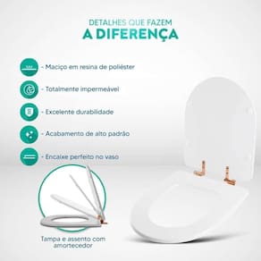 Durabilidade e Resistência: Fabricado em resina maciça de poliéster, este assento sanitário é altamente resistente e totalmente impermeável.