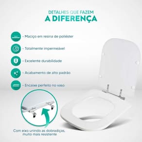 Limpeza: recomenda-se a limpeza do assento sanitário poliéster com água e sabão neutro, não utilizar produtos abrasivos.