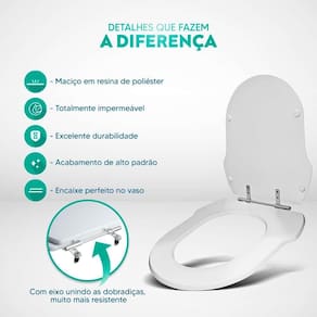 Limpeza: recomenda-se a limpeza do assento sanitário poliéster com água e sabão neutro, não utilizar produtos abrasivos.