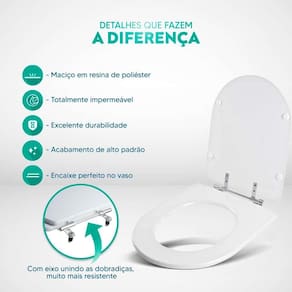 Limpeza: recomenda-se a limpeza do assento sanitário poliéster com água e sabão neutro, não utilizar produtos abrasivos.