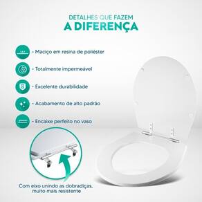 Durabilidade e Resistência: Fabricado em resina maciça de poliéster, este assento sanitário é altamente resistente e totalmente impermeável.
