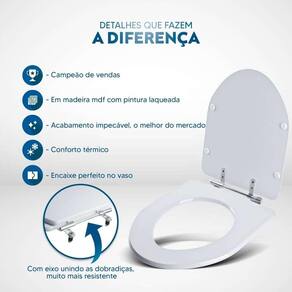 Durabilidade e Resistência: Fabricado em MDF com camadas de pintura laqueada, este assento oferece não apenas beleza, mas também conforto térmico e alta resistência. Seu acabamento impecável adiciona um toque de classe ao seu banheiro.