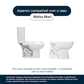 Detalhes e Cuidados Especiais: * Cor: Branco * Compatibilidade: Modelo Malva da marca Mari * Conteúdo da Embalagem: Assento sanitário, parafusos de fixação e instruções de instalação. * Fabricante do Assento Sanitário: Pontto Lavabo.