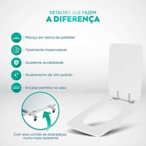 Durabilidade e Resistência: Fabricado em resina maciça de poliéster, este assento sanitário é altamente resistente e totalmente impermeável.