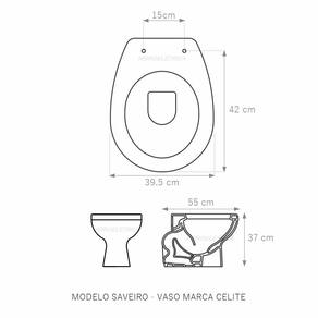 Assento Sanitário (tampa de vaso) fabricado em madeira MDF com pintura laqueada, com proteção raios UV, que garante excelente acabamento e durabilidade. Compatível com vasos (bacias/louças) sanitários com ou sem caixa acoplada. Tem calços de PVC instalados na tampa e no assento para proporcionar estabilidade ao uso, pois distribui o peso uniformemente sobre a louça sanitária. Montagem simples e fácil. Possui ferragem em alumínio anodizado que não enferruja/oxida e oferece muita resistência. O assento é acompanhado por parafusos para instalação. Embalagem dupla reforçada garante o recebimento do produto totalmente protegido. Especificações: - Dimensões da caixa: largura: 51,50cm. Altura: 4,00cm comprimento: 38,00cm - Peso do produto: 1,98kg - Acabamento: brilhante - Uso: este assento é adequado para uso na louça Celite de modelo Saveiro - Garantia: 3 meses - Itens inclusos: Tampa e assento com calços de PVC, ferragem inoxidável, embalagem duplamente reforçada. Contém todos os parafusos e encaixes para instalação, sendo necessária somente uma chave de fenda para instalar o produto na louça sanitária. Instalação: posicione o produto, devidamente centralizado, em cima do vaso sanitário. Sem desmontar a ferragem, insira as buchas de borracha dentro dos furos da bacia sanitária. Utilizando uma chave de fenda, aperte o parafuso no sentido horário até que o assento esteja firme no vaso. Manutenção: recomendamos a limpeza periódica com pano levemente umedecido com sabão neutro. Não usar esponjas abrasivas ou palha de aço nem qualquer tipo de produto químico.
