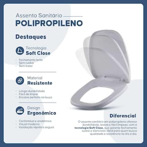 O sistema soft close é um diferencial notável deste assento, eles garantem um fechamento suave, evitando batidas indesejadas. Isso significa que a tampa e o assento descerão lentamente quando soltos (sem bater).