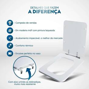 Durabilidade e Resistência: Fabricado em MDF com camadas de pintura laqueada, este assento oferece não apenas beleza, mas também conforto térmico e alta resistência. Seu acabamento impecável adiciona um toque de classe ao seu banheiro.