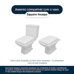 Instalação Simples e Rápida: Com todos os parafusos e componentes necessários inclusos, a instalação é rápida e descomplicada. Seu assento estará pronto para uso em questão de minutos. Desenvolvido especificamente para o modelo Square da marca Incepa, com ou sem caixa acoplada, proporciona um encaixe perfeito, oferecendo estabilidade e conforto durante o uso.
