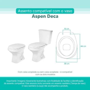 OBS.: O código 6LPF gravado na louça sanitária corresponde ao fluxo de água de uma descarga e não indica o modelo da mesma. RBN: Casa/Banho/Instalações e Acessórios de Banheiro/Vasos Sanitários e Peças/Assento de Vaso Sanitário | Conteúdo da Embalagem: 01 Assento Sanitário | Tipo: Assento Sanitário | Produto: Assento Sanitário | Site do Fabricante: www.ponttolavabo.com.br/ | Marca do Assento Sanitário: Pontto Lavabo | Garantia: 6 meses contra defeitos de fabricação | Dica: Instalação: sem desmontar o produto, posicione sobre o vaso sanitário e encaixe os dois parafusos com as borrachas pretas dentro do furo do vaso. Aperte com a chave de fenda no sentido horário até ficar firme. | Para Vaso Sanitário do Modelo: Aspen | Para vaso Sanitário da Marca: Deca | Cor: Branco | Tonalidade: Branco | Material do Assento Sanitário: MDF Laqueado | Instruções de Limpeza: Recomenda-se a limpeza com pano úmido e sabão neutro, não utilizar produtos abrasivos ou químicos | Almofadado?: Não | Peso do Produto: 1.98 | Tipo de Fechamento: Fechamento Comum | Material da Fixação: Alumínio Anodizado | Precisa de baterias ou pilhas: Não | Regulamentações aplicáveis a produtos perigosos: Não se aplica | Código de certificação: Não se aplica Ean: 7899983693339