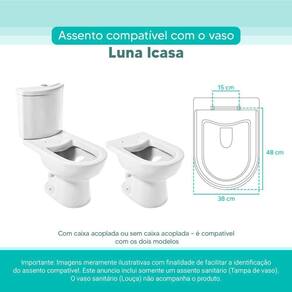OBS.: O código 6LPF gravado na louça sanitária corresponde ao fluxo de água de uma descarga e não indica o modelo da mesma. RBN: Casa/Banho/Instalações e Acessórios de Banheiro/Vasos Sanitários e Peças/Assento de Vaso Sanitário | Conteúdo da Embalagem: 01 Assento Sanitário | Tipo: Assento Sanitário | Produto: Assento Sanitário | Site do Fabricante: www.ponttolavabo.com.br/ | Marca do Assento Sanitário: Pontto Lavabo | Garantia: 6 meses contra defeitos de fabricação | Dica: Instalação: sem desmontar o produto, posicione sobre o vaso sanitário e encaixe os dois parafusos com as borrachas pretas dentro do furo do vaso. Aperte com a chave de fenda no sentido horário até ficar firme. | Para Vaso Sanitário do Modelo: Luna | Para vaso Sanitário da Marca: Icasa | Cor: Branco | Tonalidade: Branco | Material do Assento Sanitário: MDF Laqueado | Instruções de Limpeza: Recomenda-se a limpeza com pano úmido e sabão neutro, não utilizar produtos abrasivos ou químicos | Almofadado?: Não | Peso do Produto: 1.98 | Tipo de Fechamento: Fechamento Comum | Material da Fixação: Alumínio Anodizado | Precisa de baterias ou pilhas: Não | Regulamentações aplicáveis a produtos perigosos: Não se aplica | Código de certificação: Não se aplica Ean: 7899983693667