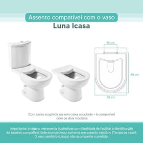 OBS.: O código 6LPF gravado na louça sanitária corresponde ao fluxo de água de uma descarga e não indica o modelo da mesma. RBN: Casa/Banho/Instalações e Acessórios de Banheiro/Vasos Sanitários e Peças/Assento de Vaso Sanitário | Conteúdo da Embalagem: 01 Assento Sanitário | Tipo: Assento Sanitário | Produto: Assento Sanitário | Site do Fabricante: www.ponttolavabo.com.br/ | Marca do Assento Sanitário: Pontto Lavabo | Garantia: 6 meses contra defeitos de fabricação | Dica: Instalação: sem desmontar o produto, posicione sobre o vaso sanitário e encaixe os dois parafusos com as borrachas pretas dentro do furo do vaso. Aperte com a chave de fenda no sentido horário até ficar firme. | Para Vaso Sanitário do Modelo: Luna | Para vaso Sanitário da Marca: Icasa | Cor: Branco | Tonalidade: Branco | Material do Assento Sanitário: MDF Laqueado | Instruções de Limpeza: Recomenda-se a limpeza com pano úmido e sabão neutro, não utilizar produtos abrasivos ou químicos | Almofadado?: Não | Peso do Produto: 1.98 | Tipo de Fechamento: Fechamento Comum | Material da Fixação: Alumínio Anodizado | Precisa de baterias ou pilhas: Não | Regulamentações aplicáveis a produtos perigosos: Não aplicável | Código de certificação: Não aplicável | Ponto de Destaque01: Produzido em MDF Laqueado | Ponto de Destaque02: Ferragem em Alumínio Anodizado (não enferruja, não oxida) | Ponto de Destaque03: Possui 15cm de distância entre furos | Ponto de Destaque04: Produto vai completo, fácil instalação | Ponto de Destaque05: Pontto Lavabo | Termos de Pesquisa01: Assento Sanitário; Tampa de Vaso Sanitário; Luna Branco Icasa; Luna 6lpf; Icasa 6lpf | Quantidade de itens: 1 | Fonte de energia: Não aplicável | Dimensões da embalagem: Altura: 5cm x Largura: 40cm x Comprimento: 50cm | Número de caixas: 1