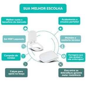 DIFERENCIAL * Possui calços que evitam o contato direto com a louça e que o assento deslize lateralmente. * Proporcionam maior estabilidade durante o uso. * Acabamento e encaixe perfeito no vaso sanitário. * Possui eixo entre as dobradiças, mantendo o assento sanitário firme na louça. * Sua ferragem metálica é super resistente e não oxida e nem enferruja.