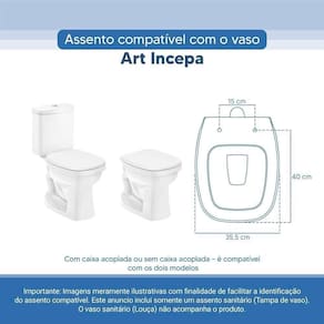 OBS.: O código 6LPF gravado na louça sanitária corresponde ao fluxo de água de uma descarga e não indica o modelo da mesma. RBN: Casa/Banho/Instalações e Acessórios de Banheiro/Vasos Sanitários e Peças/Assento de Vaso Sanitário | Conteúdo da Embalagem: 01 Assento Sanitário | Tipo: Assento Sanitário | Produto: Assento Sanitário | Site do Fabricante: www.ponttolavabo.com.br/ | Marca do Assento Sanitário: Pontto Lavabo | Garantia: 6 meses contra defeitos de fabricação | Dica: Instalação: sem desmontar o produto, posicione sobre o vaso sanitário e encaixe os dois parafusos com as borrachas pretas dentro do furo do vaso. Aperte com a chave de fenda no sentido horário até ficar firme. | Para Vaso Sanitário do Modelo: Art | Para vaso Sanitário da Marca: Incepa | Cor: Branco | Tonalidade: Branco | Material do Assento Sanitário: Poliéster | Instruções de Limpeza: Recomenda-se a limpeza com água e sabão neutro, não utilizar produtos abrasivos ou químicos | Almofadado?: Não | Peso do Produto: 2.98 | Tipo de Fechamento: Fechamento Comum | Material da Fixação: Alumínio Anodizado | Precisa de baterias ou pilhas: Não | Regulamentações aplicáveis a produtos perigosos: Não se aplica | Código de certificação: Não se aplica Ean: 7899983691847