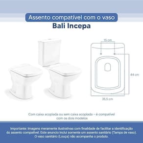 OBS.: O código 6LPF gravado na louça sanitária corresponde ao fluxo de água de uma descarga e não indica o modelo da mesma. RBN: Casa/Banho/Instalações e Acessórios de Banheiro/Vasos Sanitários e Peças/Assento de Vaso Sanitário | Conteúdo da Embalagem: 01 Assento Sanitário | Tipo: Assento Sanitário | Produto: Assento Sanitário | Site do Fabricante: | Marca do Assento Sanitário: Pontto Lavabo | : 6 meses contra defeitos de fabricação | Dica: Instalação: sem desmontar o produto, posicione sobre o vaso sanitário e encaixe os dois parafusos com as borrachas pretas dentro do furo do vaso. Aperte com a chave de fenda no sentido horário até ficar firme. | Para Vaso Sanitário do Modelo: Bali | Para vaso Sanitário da Marca: Incepa | Cor: Branco | Tonalidade: Branco | Material do Assento Sanitário: Poliéster | Instruções de Limpeza: Recomenda-se a limpeza com água e sabão neutro, não utilizar produtos abrasivos ou químicos | Almofadado?: Não | Peso do Produto: | Tipo de Fechamento: Fechamento Comum | Material da Fixação: Alumínio Anodizado | Precisa de baterias ou pilhas: Não | Regulamentações aplicáveis a produtos perigosos: Não aplicável | Código de certificação: Não aplicável | Ponto de Destaque01: Produzido em 100% Resina de Poliéster, impermeável | Ponto de Destaque02: Ferragem em Alumínio Anodizado (não enferruja, não oxida) | Ponto de Destaque03: Possui 15cm de distância entre furos | Ponto de Destaque04: Produto vai completo, fácil instalação | Ponto de Destaque05: Pontto Lavabo | Termos de Pesquisa01: Assento Sanitário; Tampa de Vaso Sanitário; Bali Branco Incepa; Bali 6lpf; Incepa 6lpf | Quantidade de itens: 1 | Fonte de energia: Não aplicável | Dimensões da embalagem: Altura: 5cm x Largura: 40cm x Comprimento: 50cm | de caixas: 1