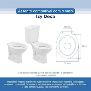 OBS.: O código 6LPF gravado na louça sanitária corresponde ao fluxo de água de uma descarga e não indica o modelo da mesma. RBN: Casa/Banho/Instalações e Acessórios de Banheiro/Vasos Sanitários e Peças/Assento de Vaso Sanitário | Conteúdo da Embalagem: 01 Assento Sanitário | Tipo: Assento Sanitário | Produto: Assento Sanitário | Site do Fabricante: www.ponttolavabo.com.br/ | Marca do Assento Sanitário: Pontto Lavabo | Garantia: 6 meses contra defeitos de fabricação | Dica: Instalação: sem desmontar o produto, posicione sobre o vaso sanitário e encaixe os dois parafusos com as borrachas pretas dentro do furo do vaso. Aperte com a chave de fenda no sentido horário até ficar firme. | Para Vaso Sanitário do Modelo: Izy | Para vaso Sanitário da Marca: Deca | Cor: Branco | Tonalidade: Branco | Material do Assento Sanitário: Poliéster | Instruções de Limpeza: Recomenda-se a limpeza com água e sabão neutro, não utilizar produtos abrasivos ou químicos | Almofadado?: Não | Peso do Produto: 2.98 | Tipo de Fechamento: Fechamento Comum | Material da Fixação: Alumínio Anodizado | Precisa de baterias ou pilhas: Não | Regulamentações aplicáveis a produtos perigosos: Não se aplica | Código de certificação: Não se aplica Ean: 7899983692165