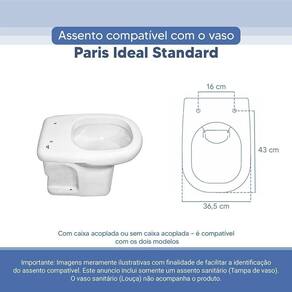 OBS.: O código 6LPF gravado na louça sanitária corresponde ao fluxo de água de uma descarga e não indica o modelo da mesma. RBN: Casa/Banho/Instalações e Acessórios de Banheiro/Vasos Sanitários e Peças/Assento de Vaso Sanitário | Conteúdo da Embalagem: 01 Assento Sanitário | Tipo: Assento Sanitário | Produto: Assento Sanitário | Site do Fabricante: | Marca do Assento Sanitário: Pontto Lavabo | : 6 meses contra defeitos de fabricação | Dica: Instalação: sem desmontar o produto, posicione sobre o vaso sanitário e encaixe os dois parafusos com as borrachas pretas dentro do furo do vaso. Aperte com a chave de fenda no sentido horário até ficar firme. | Para Vaso Sanitário do Modelo: Paris | Para vaso Sanitário da Marca: Ideal Standard | Cor: Branco | Tonalidade: Branco | Material do Assento Sanitário: Poliéster | Instruções de Limpeza: Recomenda-se a limpeza com água e sabão neutro, não utilizar produtos abrasivos ou químicos | Almofadado?: Não | Peso do Produto: | Tipo de Fechamento: Fechamento Comum | Material da Fixação: Alumínio Anodizado | Precisa de baterias ou pilhas: Não | Regulamentações aplicáveis a produtos perigosos: Não aplicável | Código de certificação: Não aplicável | Ponto de Destaque01: Produzido em 100% Resina de Poliéster, impermeável | Ponto de Destaque02: Ferragem em Alumínio Anodizado (não enferruja, não oxida) | Ponto de Destaque03: Possui 16cm de distância entre furos | Ponto de Destaque04: Produto vai completo, fácil instalação | Ponto de Destaque05: Pontto Lavabo | Termos de Pesquisa01: Assento Sanitário; Tampa de Vaso Sanitário; Paris Branco Ideal Standard; Paris 6lpf; Ideal Standard 6lpf | Quantidade de itens: 1 | Fonte de energia: Não aplicável | Dimensões da embalagem: Altura: 5cm x Largura: 40cm x Comprimento: 50cm | de caixas: 1
