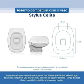 OBS.: O código 6LPF gravado na louça sanitária corresponde ao fluxo de água de uma descarga e não indica o modelo da mesma. RBN: Casa/Banho/Instalações e Acessórios de Banheiro/Vasos Sanitários e Peças/Assento de Vaso Sanitário | Conteúdo da Embalagem: 01 Assento Sanitário | Tipo: Assento Sanitário | Produto: Assento Sanitário | Site do Fabricante: www.ponttolavabo.com.br/ | Marca do Assento Sanitário: Pontto Lavabo | Garantia: 6 meses contra defeitos de fabricação | Dica: Instalação: sem desmontar o produto, posicione sobre o vaso sanitário e encaixe os dois parafusos com as borrachas pretas dentro do furo do vaso. Aperte com a chave de fenda no sentido horário até ficar firme. | Para Vaso Sanitário do Modelo: Stylus | Para vaso Sanitário da Marca: Celite | Cor: Branco | Tonalidade: Branco | Material do Assento Sanitário: Poliéster | Instruções de Limpeza: Recomenda-se a limpeza com água e sabão neutro, não utilizar produtos abrasivos ou químicos | Almofadado?: Não | Peso do Produto: 2.98 | Tipo de Fechamento: Fechamento Comum | Material da Fixação: Alumínio Anodizado | Precisa de baterias ou pilhas: Não | Regulamentações aplicáveis a produtos perigosos: Não se aplica | Código de certificação: Não se aplica Ean: 7899983692547