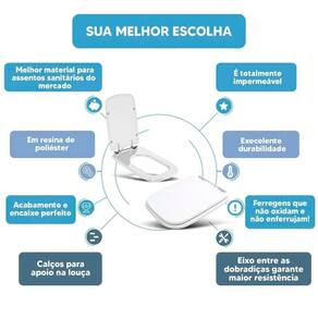 DIFERENCIAL * Possui calços que evitam o contato direto com a louça e que o assento deslize lateralmente. * Proporcionam maior estabilidade durante o uso. * Acabamento e encaixe perfeito no vaso sanitário. * Possui eixo entre as dobradiças, mantendo o assento sanitário firme na louça. * Sua ferragem metálica é super resistente e não oxida e nem enferruja.