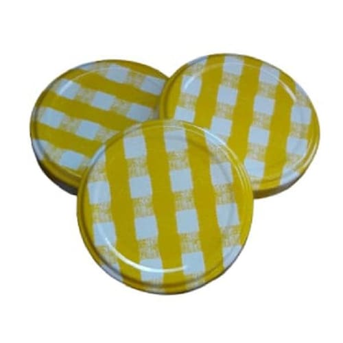 100 unidades de tampas tamanho 63 mm na cor xadrez amarela. Ideal para potes de vidro de diversos estilos, tais como: 150 ml, 170 ml sextavado, 200 ml sextavado, 200 ml liso, 240 ml, 268 ml, 350 ml. Ficha técnica - Forma: Circular - Diâmetro: 63 mm Marca: Não Informado