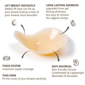 - Aparência natural e elevação instantânea dos seios: esses pastéis para mamilos com fita adesiva adicional fornecem uma elevação suave para seus seios. O design mais grosso, centralizado e com bordas mais finas faz com que o sutiã se ajuste perfeitamente à curva dos seios. O design com microborda o torna perfeito e invisível sob a roupa.