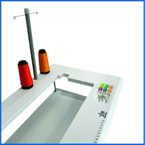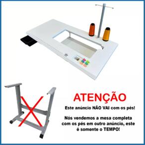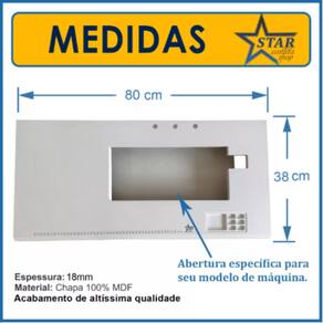 Tampo em MDF de 18mm revestido em PVC com fita métrica gravada. Abertura para armazenamento de bobinas e agulhas. Suporte para dois cones de linha. Base de apoio para a máquina. Hastes de suporte para cones. Gaveta plástica.Alça retrátil