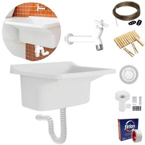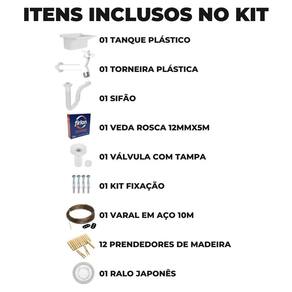 ITENS INCLUSOS 01 Tanque 01 Sifão 01 Torneira Plástica 01 Rolo de Fita Veda Rosca 12mm x 10m 01 Válvula Com tampa 06 Buchas S10 04 Parafusos 3,5 x 55mm 02 Parafusos 3,5 x 75mm 02 Espaçadores 02 Arruelas 01 Varal em Aço e PVC com 10 Metros 02 Presilhas Plásticas Para Travamento 12 Prendedores de Roupa em Madeira 01 Ralo em Inox 4,7cm Marca: Não Informado