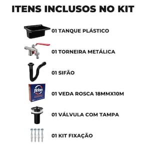 Tanque Plástico 22L Para Lavanderia Preto O uso do tanque de lavar roupa é ideal para lavagem de roupas delicadas, como roupas íntimas, de bebês e peças que requerem atenção especial, pois permite um controle mais preciso da temperatura e movimento das roupas durante a lavagem. Também é uma opção prática para pré-lavagem de roupas muito sujas antes de colocá-las em uma máquina de lavar. O tanque de lavar roupa é uma opção acessível e prática para quem deseja lavar roupas à mão sem abrir do conforto e da praticidade de um equipamento projeto para essa finalidade. ESPECIFICAÇÕES TÉCNICAS Material: Polipropileno Dimensões: 47,2 x 42,8 x 26,7cm Capacidade: Volume útil/total 13 / 22 Litros Locais Sugeridos: Lavanderias Acompanha Torneira: Não Acabamento: Brilhante Cor: Preto Torneira de Metal Para Jardim Quintal Tanque Com Bico 1/2 Esta torneira é fabricada em metal de alta qualidade, o que garante sua resistência à corrosão e a capacidade de resistir às condições climáticas adversas ao ar livre. Equipada com um bico de 1/2 e um único comando, será facil de operar e ajustar para atingir a pressão que você está procurando. O design ergonômico do punho facilita a abertura e o fechamento da torneira, tornando o uso confortável e prático. CARACTERÍSTICAS - Construção em metal durável e resistente à corrosão - Bico de 1/2 polegada para um fluxo de água controlável - Fácil instalação em sistemas de encanamento padrão - Design ergonômico para facilitar o uso - Versatilidade para uma variedade de aplicações em áreas externas FICHA TÉCNICA Modelo: Torneira de Aço 1/2 Uso: Jardins, quintais, tanques entre outros ambientes externos Material: Liga de zinco Tamanho do Bico: 1/2 Polegada Sifão Sanfonado Universal 61cm Preto O sifão sanfonado universal é um acessório essencial de encanamento, projetado para se adaptar a qualquer saída de válvula de pia e a qualquer tubulação de esgoto, independentemente de seu tamanho ou tipo. Além disso, o sifão sanfonado universal corrige possíveis desalinhamentos entre a cuba e a tubulação de despejo, evitando assim a formação de bloqueios e obstruções que possam causar vazamentos ou refluxo de água suja. Esse acessório é ideal para tanques, pias e cubas em banheiros, cozinhas e lavanderias. Ele também é resistente a altas temperaturas, suportando água fria e quente até 90C, o que o torna adequado para ser em qualquer tipo de ambiente. Este sifão é compatível com tubos e conexões de 38, 40, 48 e 50mm, garantindo uma instalação fácil e segura, sem necessidade de ferramentas especiais. Ele é feito de plástico ABS de alta qualidade, o que o torna resistente a rachaduras, corrosão e vazamentos, garantindo sua durabilidade ao longo do tempo. Em resumo, o sifão sanfonado universal é uma solução confiável e prática para quem procura um acessório de encanamento que seja fácil de instalar e que possa se adaptar a diversas situações de encanamento. Sua capacidade de corrigir desalinhamentos e impedir o retorno de mau cheiro da tubulação de esgoto torna-o uma escolha inteligente e eficaz para garantir a segurança e higiene em sua casa ou negócio. ESPECIFICAÇÕES TÉCNICAS Material: Polipropileno Entrada Para Válvula Polegada : 7/8 Saída Para Tubos e Conexões: 38, 40, 48 e 50mm Modelo: Para pias, cubas, tanques, lavatórios e válvula americana Suporta temperatura até: 90 graus Cor: Preto Acabamento: Brilhante Manual de Instalação: Sim ITENS INCLUSOS 01 Tanque 01 Válvula Com tampa 06 Buchas S10 04 Parafusos 3,5 x 55mm 02 Parafusos 3,5 x 75mm 02 Espaçadores 02 Arruelas 01 Torneira de Metal 1/2 01 Sifão 01 Adaptador Universal 01 Rolo de Fita Veda Rosca 18mm x 10m