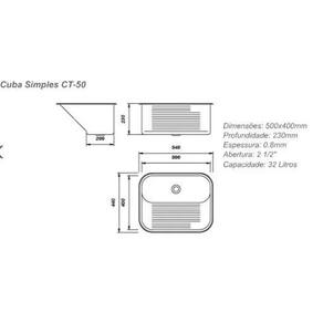 Medidas (CxLxP) 500x400x230mm em inox AISI 304 com 0,8mm de espessura.