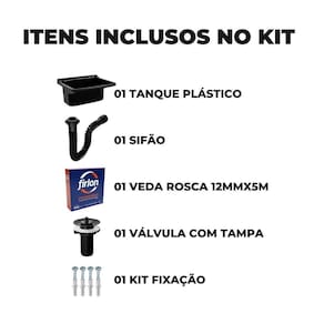 Tanque de plástico 34l para lavanderia preto + sifão universal sanfonado + fita veda rosca Tanque plástico 34l para lavanderia preto astra O uso do tanque de lavar roupa é ideal para lavagem de roupas delicadas, como roupas íntimas, de bebês e peças que requerem atenção especial, pois permite um controle mais preciso da temperatura e movimento das roupas durante a lavagem. Também é uma opção prática para pré-lavagem de roupas muito sujas antes de colocá-las em uma máquina de lavar. O tanque de lavar roupa é uma opção acessível e prática para quem deseja lavar roupas à mão sem abrir do conforto e da praticidade de um equipamento projeto para essa finalidade. Especificações técnicas Material: polipropilen Dimensões: 54 x 47 x 31,1cm Capacidade: volume útil/total 20 / 34 litros Locais sugeridos: lavanderias Acompanha torneira: não Acabamento: brilhante Marca: astra Cor: preto Sifão sanfonado universal 61cm preto astra O sifão sanfonado universal astra é um acessório essencial de encanamento, projetado para se adaptar a qualquer saída de válvula de pia e a qualquer tubulação de esgoto, independentemente de seu tamanho ou tipo. Além disso, o sifão sanfonado universal astra corrige possíveis desalinhamentos entre a cuba e a tubulação de despejo, evitando assim a formação de bloqueios e obstruções que possam causar vazamentos ou refluxo de água suja. Esse acessório é ideal para tanques, pias e cubas em banheiros, cozinhas e lavanderias. Especificações técnicas Material: polipropileno Entrada para válvula polegada : 7/8 Saída para tubos e conexões: 38, 40, 48 e 50mm Modelo: para pias, cubas, tanques, lavatórios e válvula americana Suporta temperatura até: 90 graus Cor: preto Acabamento: brilhante do fabricante: 90 dias Fita veda rosca teflon 12mm x 5m firlon Fita veda rosca teflon firlon é produzida pela plastifluor que líder de produção para o mercado brasileiro. Produto com excelência em qualidade, supera a norma abnt nbr 16368:2015. Especificações técnica Composição química: ptfe poli-tetra-fluor-etileno . Aplicação: vedação de roscas e conexões em tubulações de água fria, água quente, vapor, combustíveis, fluidos e gases em geral. Temperatura de trabalho: de - 90c até +240c. Resistência química: material de baixíssima reatividade química, resistente aos líquidos e gases comumente utilizados em instalações industriais como: ácidos, bases, solventes, combustíveis, lubrificantes, vapor, gases de processo etc. Compatibilidade com oxigênio: compatível com oxigênio líquido ou gasoso em temperatura ambiente e criogênicas. Consultar quanto ao uso acima de 50c. Tolerâncias dimensionais: sempre maior ou igual que a espessura e densidade mínima. Marca: firlon Fabricante: plastifluor Comprimento: 5 metros Largura: 12 milímetros O kit segue com todos os itens para montagem e pronto para uso após a instalação - 90 dias para o tanque - 90 dias para o sifão Itens inclusos 01 tanque 01 sifão 01 rolo de fita veda rosca 12mm x 5m 01 válvula com tampa 06 buchas s10 04 parafusos 3,5 x 55mm 02 parafusos 3,5 x 75mm 02 espaçadores 02 arruelas