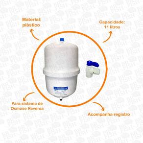 Tanque Reservatório Pressurizado para Osmose Reversa - 11 Litros 3.0 G Informações do Produto Reservatório pressurizado que possui um diafragma interno para aumentar a pressão da água e sua vazão em sistemas de Osmose Reversa. Capacidade interna é de 60 a 70% do seu volume nominal. Especificações do Produto - Volume nominal: 11 litros 3.0 galões - Volume útil: 7 litros - Diâmetro externo: 25 cm - Altura: 37 cm - Peso: 1,8 Kg - Conexão 1/4 - Cor: Branca - Material: plástico Marca: Não Informado