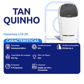 TANQUINHO COLORMAQ ECOMAX 20KG SEMIAUTOMÁTICO TURBILHONAMENTO LCS 20 Leve a praticidade para o seu dia a dia com o Tanquinho Colormaq 20 kg. Desenhado para simplificar suas tarefas domésticas, este tanquinho oferece uma capacidade generosa aliada a eficiência energética, garantindo resultados excepcionais. Confira mais detalhes:
