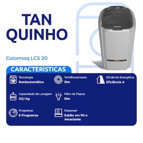 Características: Marca: Colormaq Modelo: LCS 20 Capacidade de lavagem: 20 kg Programas: 6 programas Níveis de água: 3 níveis Material do cesto: Polipropileno Abertura da tampa: Superior Pés niveladores: Não Dispenser para alvejante: Não Dispenser para sabão em pó: Sim Dispenser para amaciante: Sim Desligamento automático: Sim Molho: Sim Filtro de fiapos: Sim Eficiência energética: A Potência: 380 W Consumo: 0,005 kWh/ciclo/kg Frequência: 60 hz
