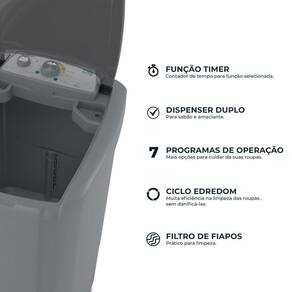A função Timer garante o controle ideal de cada ciclo, ajustando o tempo conforme a necessidade de cada tipo de roupa. Já o Dispenser Duplo do Tanquinho Britânia assegura a dosagem correta de sabão e amaciante, proporcionando resultados impecáveis e tecidos mais macios ao toque.
