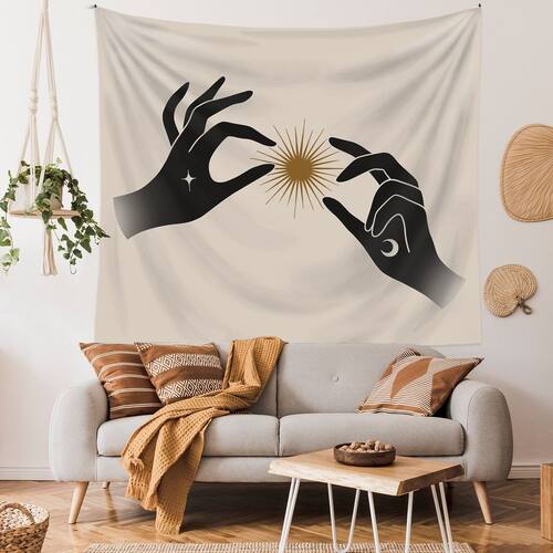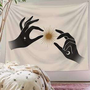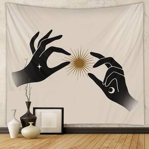 Material: flanela Tamanho: 130 cm × 150 cm Peso: 290 g Design celestial boêmio — Apresenta mãos pretas abstratas segurando um raio de sol dourado com detalhes de lua e estrela, criando uma atmosfera mística e moderna. Tapeçaria de parede versátil — perfeita como decoração artística de parede, colcha, capa de sofá, cortina de teto ou pano de fundo para quartos, salas de estar ou dormitórios. Material de veludo macio — Feito de tecido de veludo de alta qualidade com textura suave, impressão vibrante e qualidade durável para uso duradouro. Tamanho ideal 150 x 130 cm — Grande o suficiente para servir como uma peça marcante, aprimorando interiores minimalistas, boêmios e modernos com charme celestial. Fácil de pendurar e manter — Design leve e dobrável, fácil de pendurar com ganchos ou clipes; lavável à máquina e resistente ao desbotamento para um cuidado conveniente.