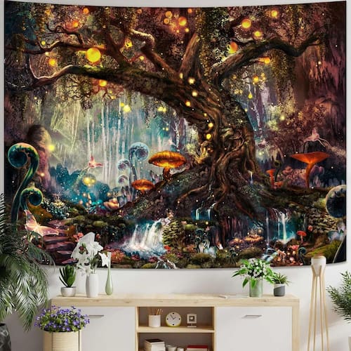 Material: Pele de pêssego Tamanho: 150 cm × 130 cm Peso: 260 g Enchanted Forest Design — Apresenta uma árvore da vida mística cercada por luzes brilhantes, cogumelos, cachoeiras e detalhes de fadas, criando uma atmosfera mágica de fantasia. Tecido de pele de pêssego premium — Feito de poliéster de pele de pêssego de alta qualidade, oferecendo uma textura suave, cores vibrantes e um toque leve e durável. Decoração artística de parede multiuso — pode ser usada como decoração de parede, colcha, capa de sofá, cortina ou cenário fotográfico, aprimorando qualquer ambiente com um charme fantástico. Fácil de instalar e manter — A tapeçaria leve e dobrável é simples de pendurar com pregos, alfinetes ou ganchos; lavável à máquina para facilitar o cuidado. Escolha de decoração perfeita — Adequada para quartos, salas de estar, dormitórios, espaços de meditação ou estúdios criativos, fazendo com que seu espaço pareça sonhador e artístico.